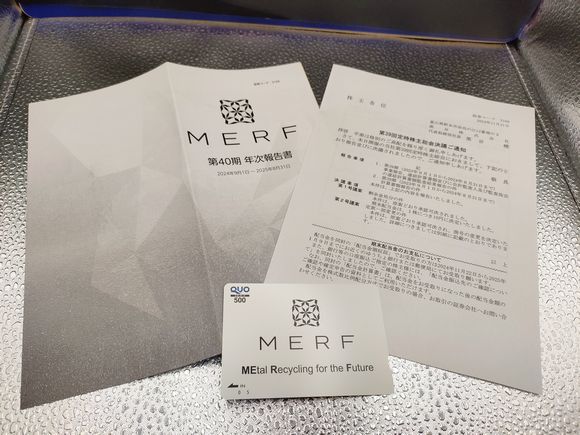 MERF(3168)~旧黒谷の株主優待 株主優待~個別株 X Facebook はてブ LINE コピー 2023.11.292025.12.02 TradingViewですべてのマーケットを追跡 MERF(黒谷) 富山が本社のメタルリサイクル、主に銅のリサイクルが中心。銅合金インゴットは銅リサイクル原材料や銅合金リサイクル原材料から作られ、船舶用スクリューや水栓器具、バルブ類など各種産業機械に使用されてます。また、美術品も手掛けており、純金の美術工芸品を販売してます。(PCでレイアウトしてますので、スマホは横向きが見やすくなってます。) 株主優待 ノーマルからMERFのロゴ、QUOカード500円分です。8月の権利確定でもらえます。 TradingViewですべてのマーケットを追跡 Track all markets on TradingView